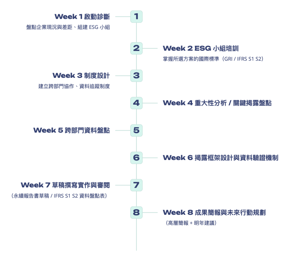 八週系統化企業陪跑方案,幫助公司獨立完成永續報告書/IFRS S1 S2 揭露,建立長期穩定的內部能力。