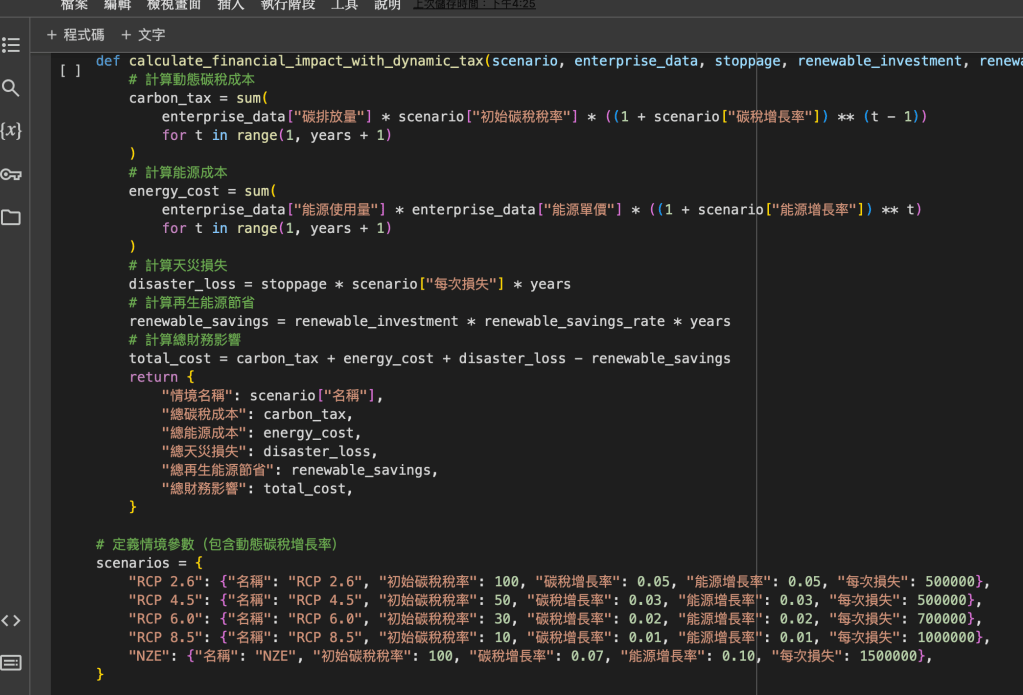 選擇好各項永續變數(碳費、電費、天災損失次數、再生能源投資節省電費率)