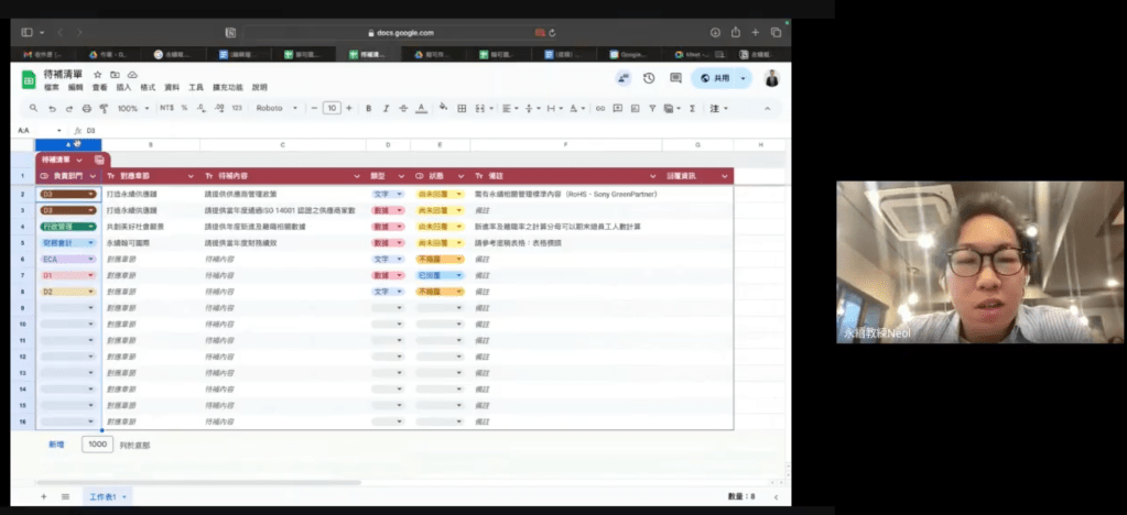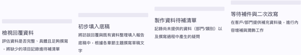 接著,我們會針對需要補充的資料,建置一份「待補清單」,例如是否需要補上KPI、制度執行細節,或者加入一段來自部門的實務案例,以增加客戶或部門同仁回補資料的成效。