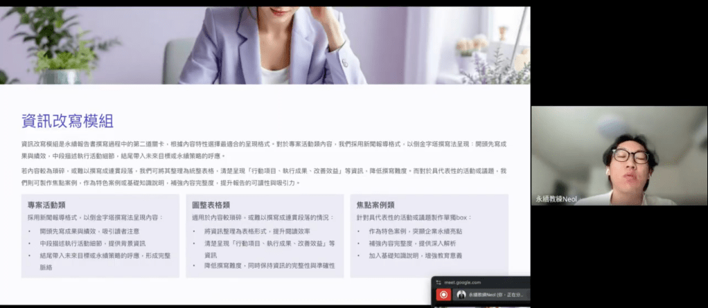 有些資料來自部門的簡報,那通常是拿來對內說明或對外展示的。這類內容看似完整,實際上卻常常沒辦法直接使用。我們練習如何擷取出與主題真正有關的內容,運用AI產出初步草稿後,再由人來判斷這段文字是否真的「對了題」。