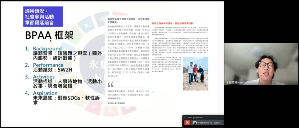 如果我們要寫一段專案活動的內容,那我會請學員用「新聞報導」的寫法來處理。不要先講一堆背景,而是先把成果跟意義擺上來,讓人一看就知道這段內容有什麼價值。這種「倒金字塔」的邏輯,看似簡單,但真正能做到的,少之又少。