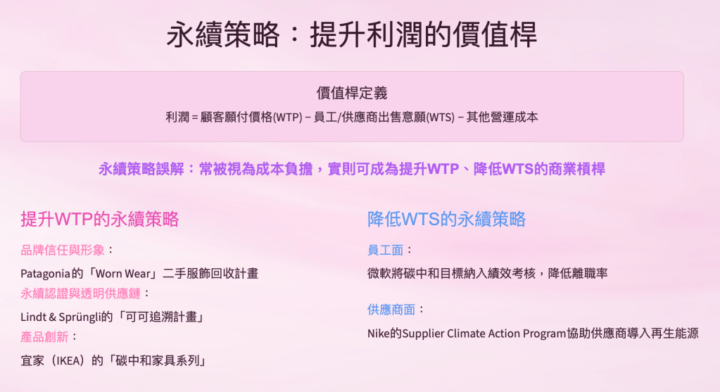 事實上,永續完全可以成為「雙效槓桿」,可透過差異化產品與可信品牌,拉高 WTP;透過改善環境(內外部皆然)與供應商穩定合作,壓低 WTS。