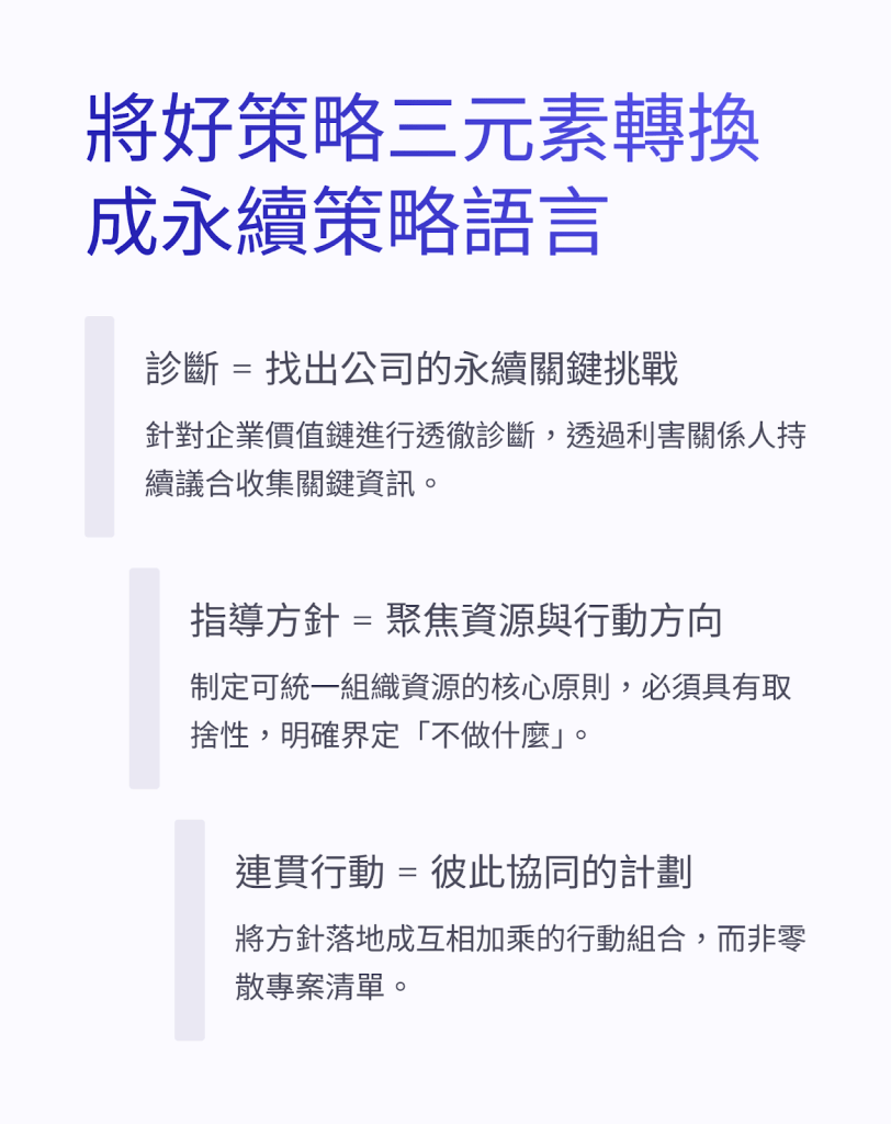 在永續領域,策略同樣需要「診斷 → 指導方針 → 連貫行動」的結構,否則很容易停留在口號層面。將作者的好策略三元素融入到永續策略制定過程中,讓企業更聚焦、更有效地把 永續的理念轉化為實際競爭力。