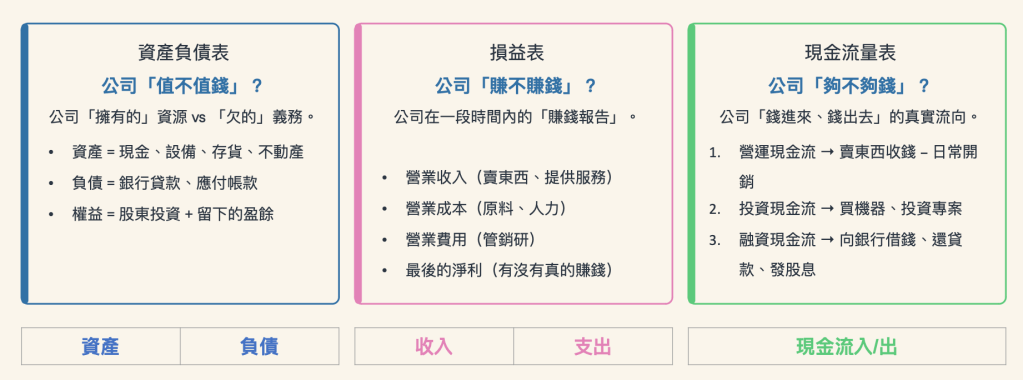 一般我們看到的財務報表,可以分成三大報表,分別是: