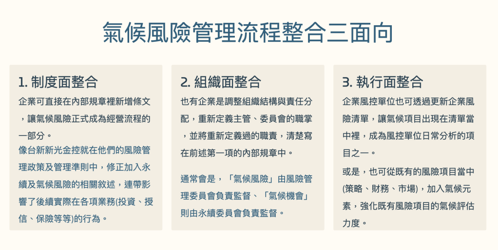 除了風險管理的流程,另外一塊就會是如何將氣候風險「整合」到公司本來就有的風控制度中了。