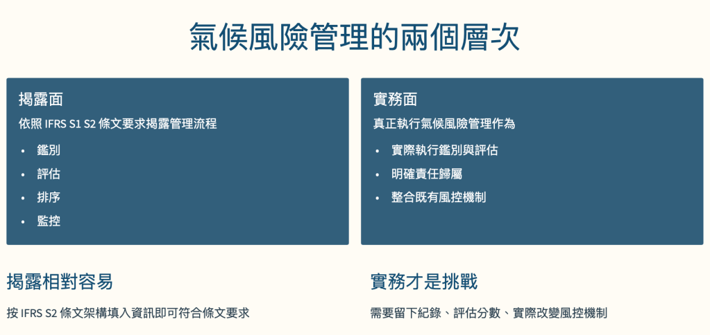 第一個層次是「揭露面」,也就是依照 IFRS S1 S2 條文要求揭露管理流程、有沒有整合納入企業既有風險管理機制。