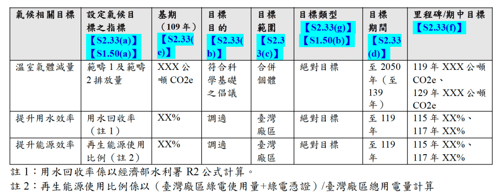 - 氣候相關資本支出佔比(財報中亦須加以附註說明)