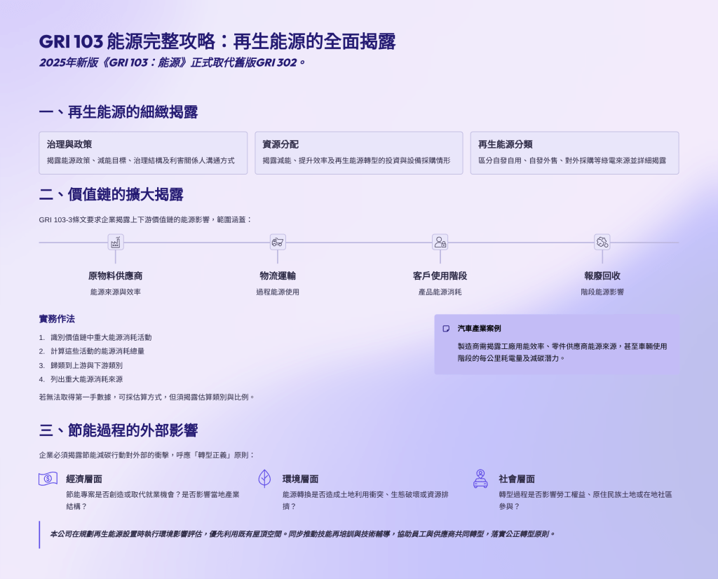 總結來看,新版 GRI 103 並不是單純把能源揭露條文變多,而是正式將「能源」從環保部門的數據彙總,提升至公司治理與資本配置的決策層級。