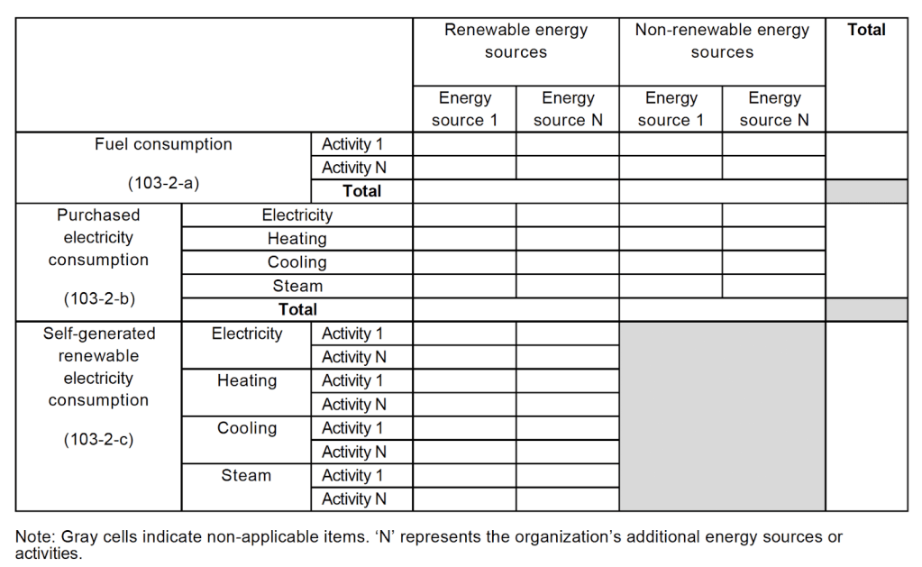 新版 GRI 103 在條文 103-1 中明確要求:企業必須揭露能源政策、減能與再生能源目標、治理結構(像是哪一部門專責能源管理的目標追蹤或達成),以及如何與利害關係人溝通與其受到的影響。