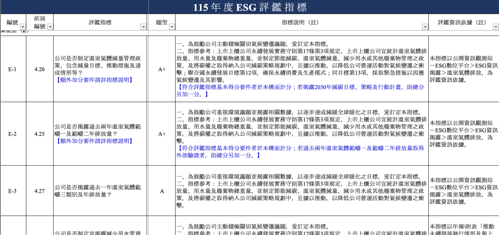 同樣的邏輯也適用在 ESG 評鑑。新版 115 年度評鑑指標已明確要求公司揭露氣候風險(E-11)、人權盡職調查(S-2)、生物多樣性政策(E-14)、自然碳匯策略(E-15)等項目。