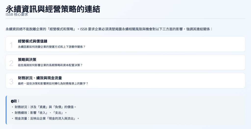 尤其,永續資訊絕不能脫離企業的「經營模式和策略」。ISSB 要求企業必須清楚揭露永續相關風險與機會對以下三方面的影響,強調其連結關係: