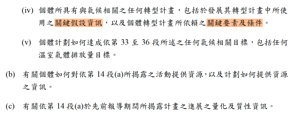 依據IFRS S2 的條文,在策略和決策的揭露要求中,提及企業必須揭露與氣候相關的轉型計畫。在第14條中,準則要求企業說明:
