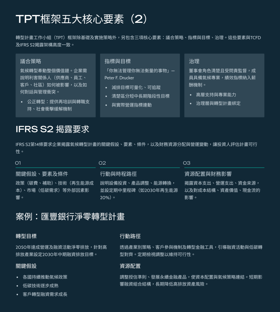 這正是下篇要處理的核心。我們將從TPT框架的其他三項要素談起,再來就是向大家說明IFRS S2 的策略要素當中,針對氣候轉型計畫的揭露要求,並進而提出揭露引導,讓企業能夠加以採用。