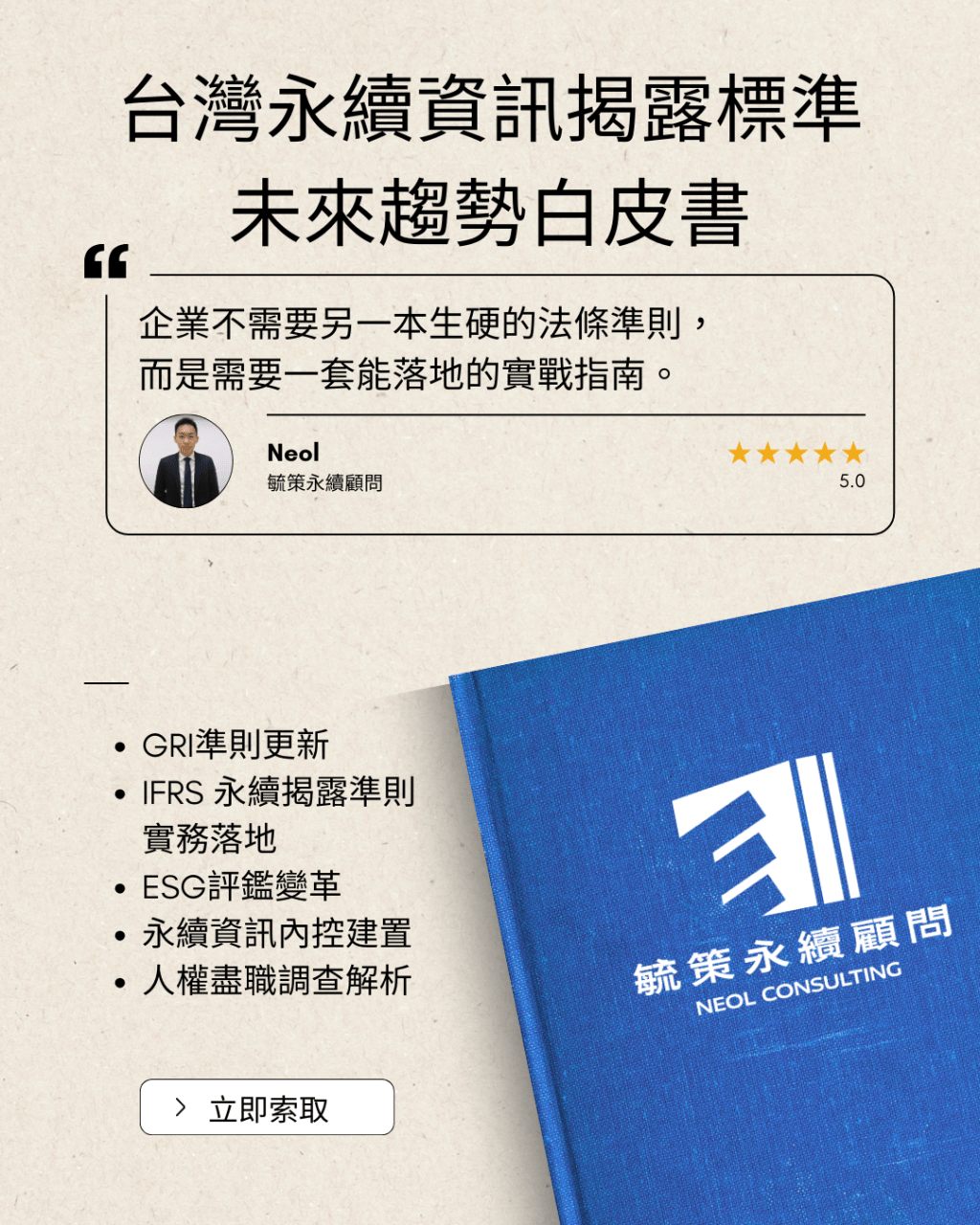 永續趨勢及各項標準變化快速,為了協助企業在變局中站穩腳步,我們深知企業不需要另一本生硬的法規翻譯本,而是需要一套能落地的實戰指南。