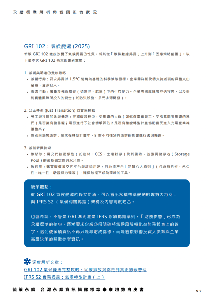 - 未來永續標準前瞻:未來 GRI 準則更新、IFRS 永續揭露準則(S3 S4)、TISFD(社會與不平等相關財務揭露)