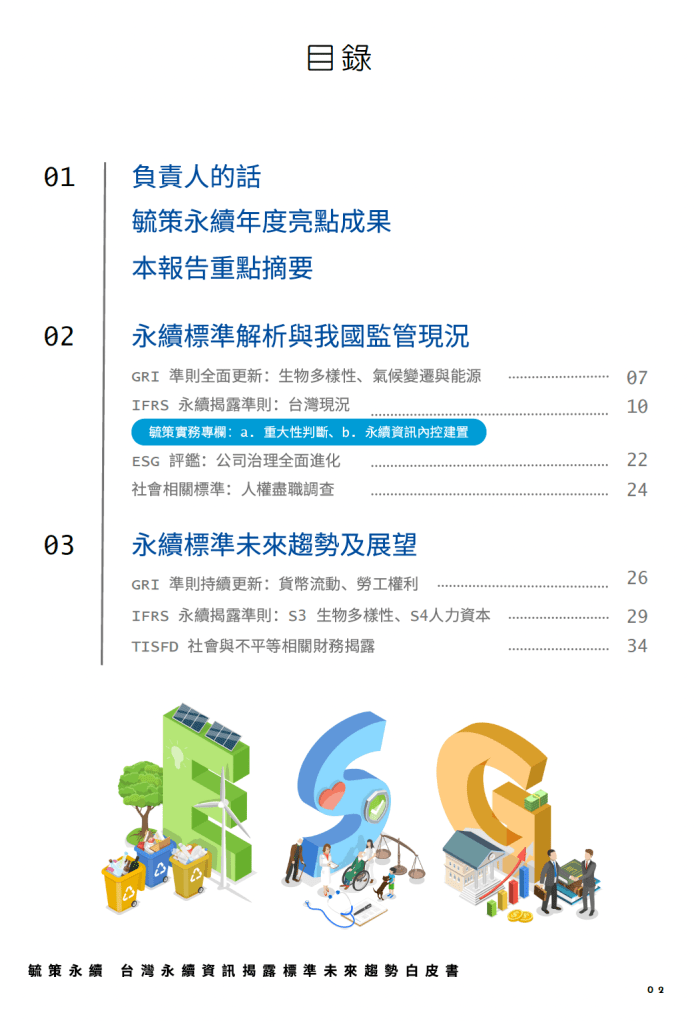 - IFRS 永續落地實務:首度公開「重大性判斷」與「永續資訊內控建置」兩大實務專欄,助企業將永續資訊完整納入日常營運過程 。